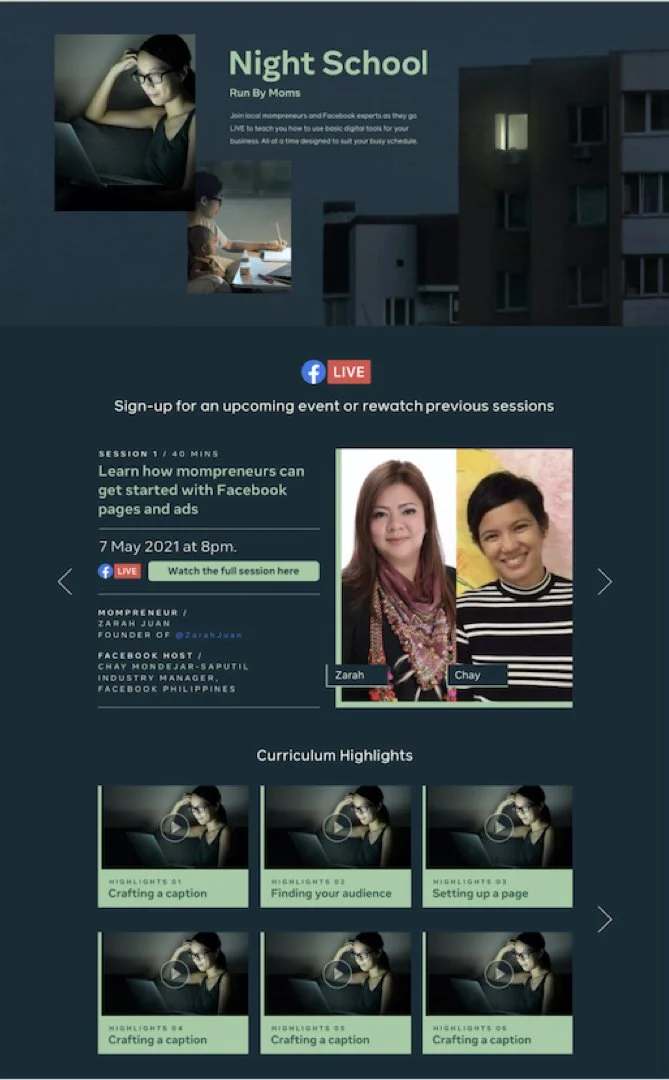 The defining activation of the campaign was a series of educational Facebook Live classes with detailed information about topics which moms had chosen. Each session was run by moms, for other moms, and was held at a time that mompreneurs told us worked best for themβafter their kids went to bed.